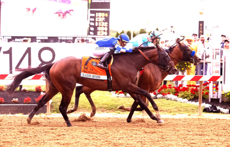 The Capeks’ Rodeo Creek Racing LLC’s Blazing Sevens finished a head behind National Treasure in the 148th running of the second leg of the Triple Crown at Pimlico Race Course Saturday.